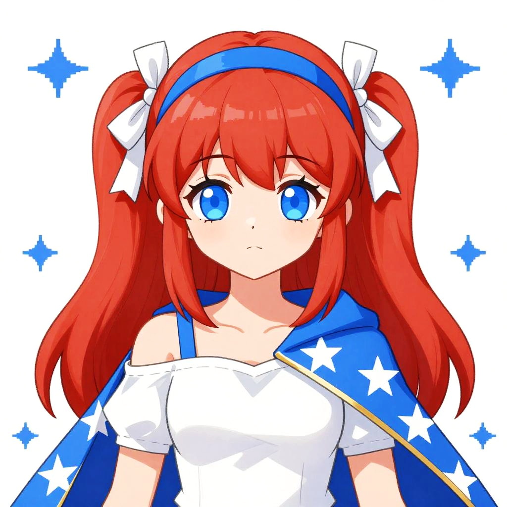 Anime-style digital drawing of a cute red-haired girl with large blue eyes and a blue headband. She has twin ponytails with white ribbons and wears a white, off-shoulder top with a blue cape featuring white stars. Her expression is neutral, and the background is a white, starry pattern. The art has a vibrant, pixelated texture.