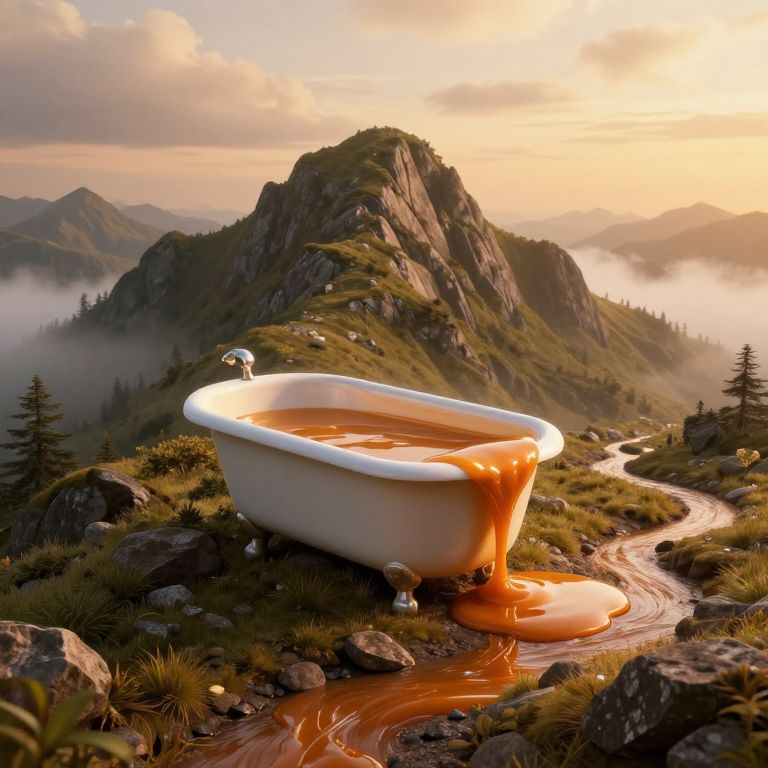 A digital artwork depicts a white, vintage clawfoot bathtub filled with amber-colored liquid, situated on a rocky, mountainous terrain at sunset. The tub, with water cascading over its edge, sits on lush grass near a winding stream. Majestic mountains with dark green forests and a misty valley fill the background. The sky glows with warm orange and pink hues, contrasting with the cool, dark green and brown of the landscape. The scene is surreal, blending natural beauty with the unexpected presence of the bathtub.