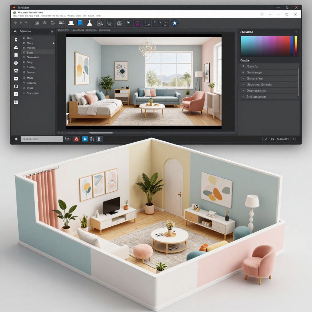 AI room planner free, advanced architectural software interface, realistic room model with customizable elements, modern Scandinavian decor, pastel tones, crisp details, immersive perspective, tech-inspired functionality, vibrant creative space