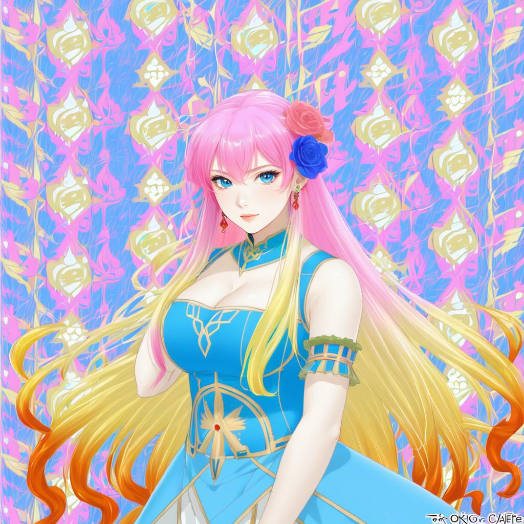 Anime-style illustration of a young woman with long pink to blonde gradient hair adorned with red and blue flower hair accessories. She has blue eyes and is wearing a detailed blue dress with gold accents, matching earrings, and an arm band with green details. The background features a colorful abstract pattern in pink, blue, and gold.