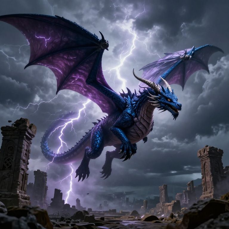 A majestic mahoroga dragon soaring through stormy skies above ancient ruins, lightning crackling around its massive wings, painted with dark blues and purples, epic fantasy landscape, detailed textures and dramatic lighting