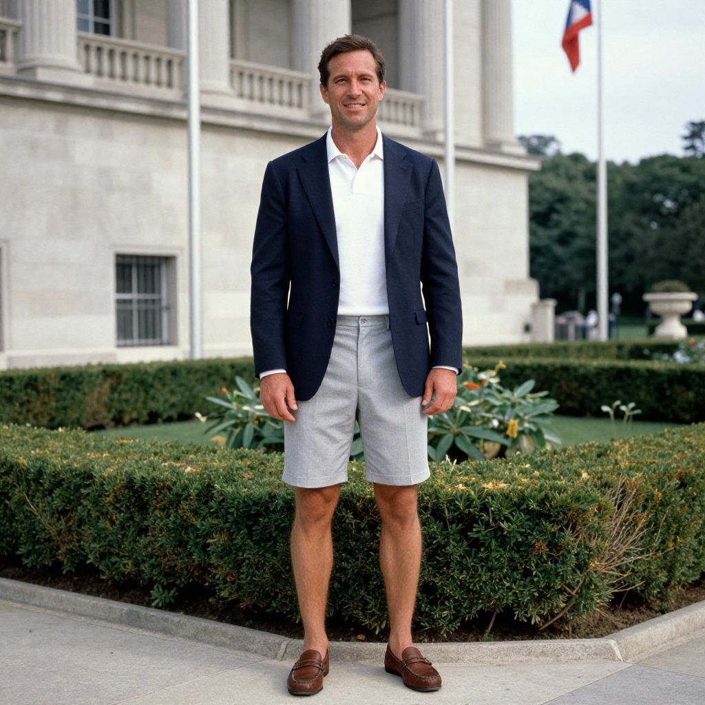 Photograph of a smiling, athletic man in a navy blazer, white shirt, white shorts, and brown loafers, standing in front of a