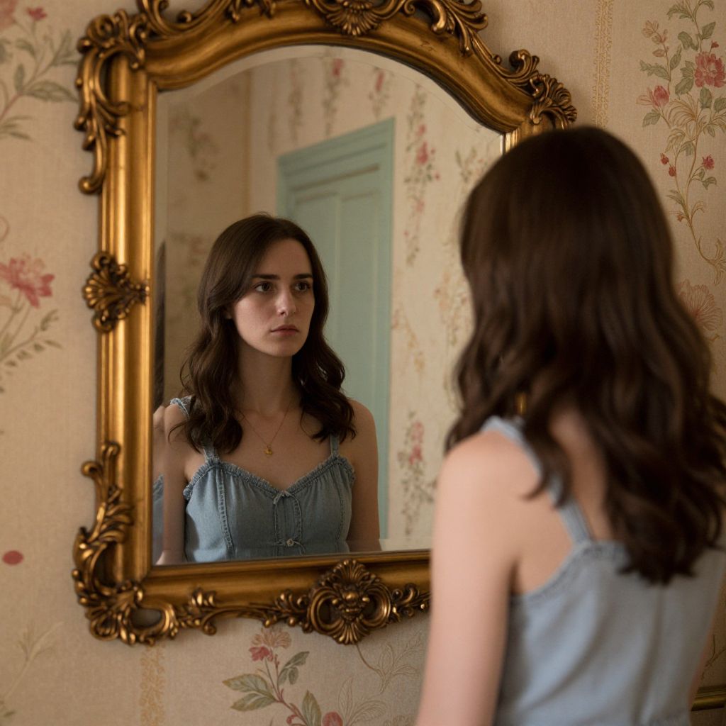 Woman stands before an ornate gold-framed mirror, her reflection revealing a contemplative gaze as she examines her alternate self in a vintage room adorned with floral wallpaper.