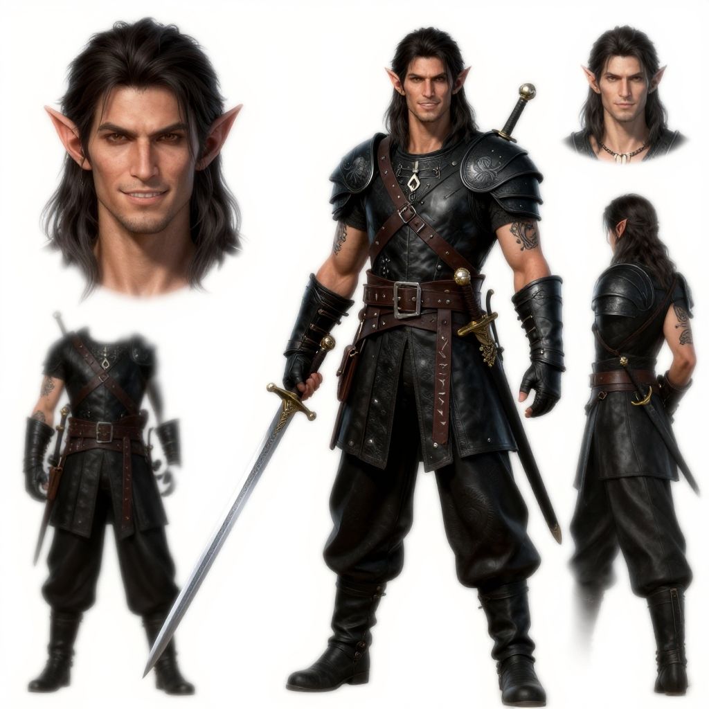 ((masterpiece, best quality, highres, realistic)) Perfect Face, (detailed face). elf ears, swashbuckler, solo, black leather armor, pauldrons with an octopus design embosed, muscular male, no beard, no facial hair ((masterpiece: 1.4, perfect face, best quality: 1.2)), ultra highly detailed, detailed eyes, delicate hair details, Clean shaven, no beard armor faulds, devilish grin, dark hair, intricate details, black leather boots, wide baggy pants trousers, tassel belt accessories, swashbuckler/pirate brown leather hip belt with pouch on right side of hip, Rapier-cutlass-sword sheathed, leather gloves, saturated dark tones, fantasy aesthetic, (flat saturated colors), fine details, intense, (lineart:1.33), charactersheet, reference sheet, multiple views, elf ears, nautical trible tattoos on arms, ornate sword held by the handle in the right hand, Musketeer sword, sword, rune symbols, Black Armor, Triton slung on back, sharh tooth necklace, no facial jewelry, ornate-pearl handled- damasks kitchen knife in belt sheath