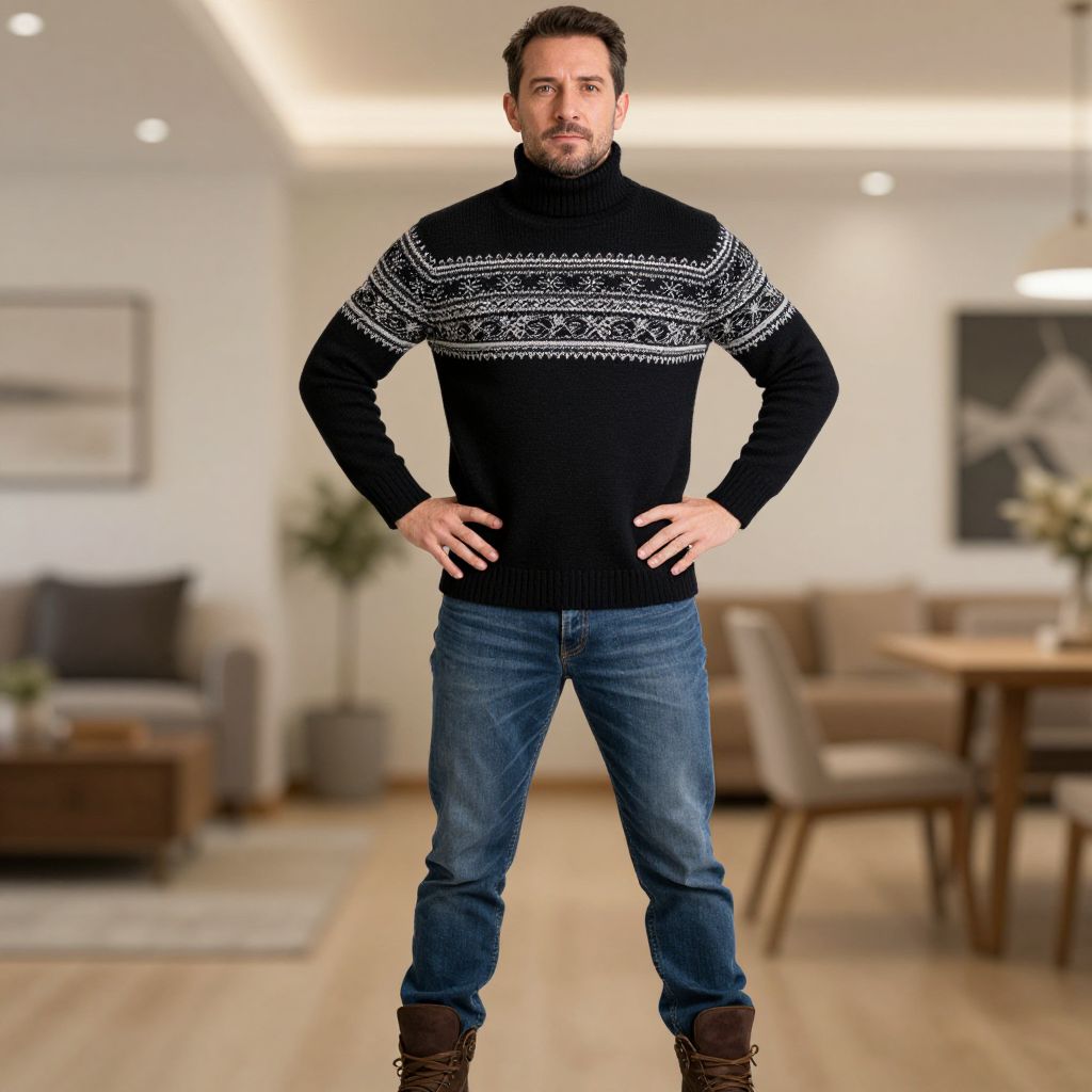 A man wearing a black turtleneck sweater with a patterned design on the front and blue jeans, standing with his hands on his hips, wearing brown boots. The scene is set in a cozy, well-lit indoor space with soft ambient lighting, emphasizing the texture of the sweater and the detailed pattern on the front. The man has a strong, confident posture, exuding a sense of calm authority. The background is blurred to focus on his expression and the intricate design of his clothing.