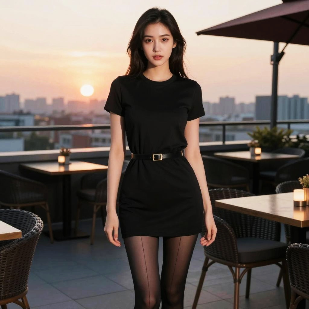 A willowy woman in a minimalist black t-shirt dress cinched at the waist with a thin gold belt and sheer black tights with a vertical stripe pattern stands on a steakhouse rooftop terrace dining, surrounded by a stunning sunset view. The visual style is vertical inc. Sexy. Pretty face and beutiful eyes