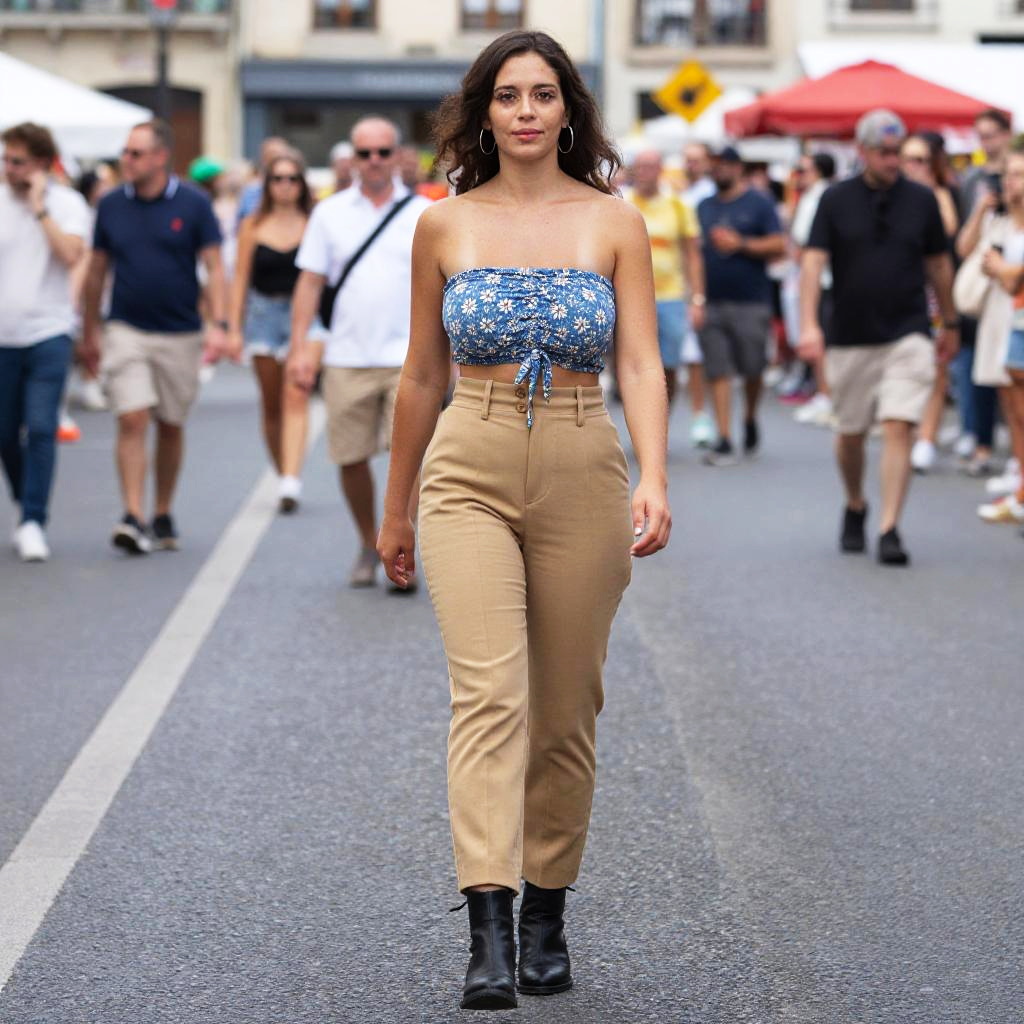 A woman, in the visual style of Diego Fazio, wearing a strapless blue crop top with a white floral print and khaki high-waisted trousers, standing in a vibrant street parade in Paris, complemented by black leather ankle boots and silver hoop earrings, with minimal makeup and a natural hairstyle. Sexy. Pretty face and beаutiful eyes. Big breasts