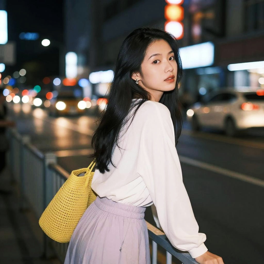 Photograph of an Asian woman with long, straight black hair, standing on a nighttime city street. She wears a white long-sleeve blouse and a high-waisted, light purple skirt, holding a large, yellow crocheted handbag over her shoulder. She has a delicate, confident expression, with subtle makeup and small earrings. The background is blurred with colorful city lights and car headlights, creating a bokeh effect. The street has a metal railing she leans on, with buildings and traffic visible in the distance. The lighting highlights her smooth, fair skin and the crisp textures of her clothing.
