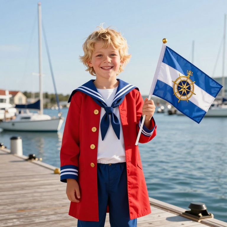 A cheerful 10-year-old boy dressed as a sailor captain, wearing a detailed sailor suit with a gold compass pinned to his chest, a full-length red sailor coat, and a large ship's flag in his hand. He has a round face, a wide smile, and tousled golden hair, standing on a pier during a sunny afternoon with a sailboat floating in the harbor.