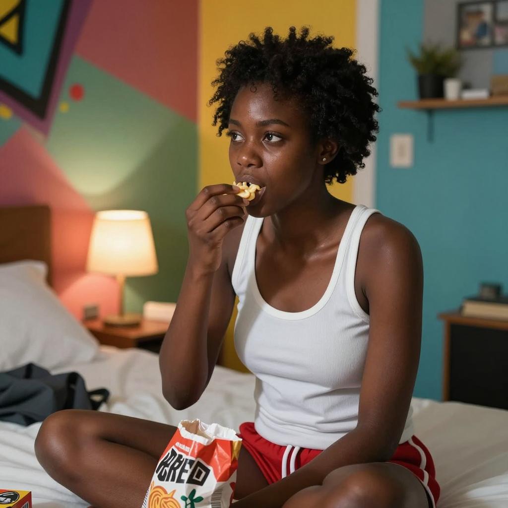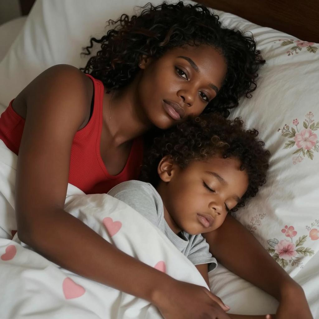Black woman with dark skin and wavy hair lies next to sleeping black boy with curly hair. She wears a red sleeveless top, white blanket with pink heart pattern. Both on floral-patterned bed. Woman's eyes are open, looking forward. Boy's eyes are closed. Woman's arm rests on boy's shoulder. Soft, dim lighting.