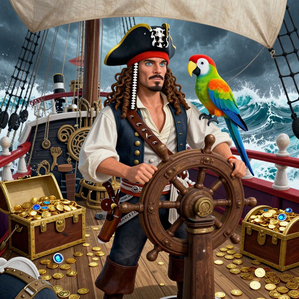 Vibrant, whimsical illustration of a swashbuckling pirate captain standing at the helm of his ship, surrounded by turbulent stormy seas, with a colorful parrot perched on his shoulder, treasure chests overflowing with gold coins, jewels, and other booty scattered across the deck, cartoon style, anaglyph 3D effect, Man has masculine face and piercing eyes