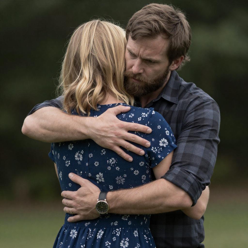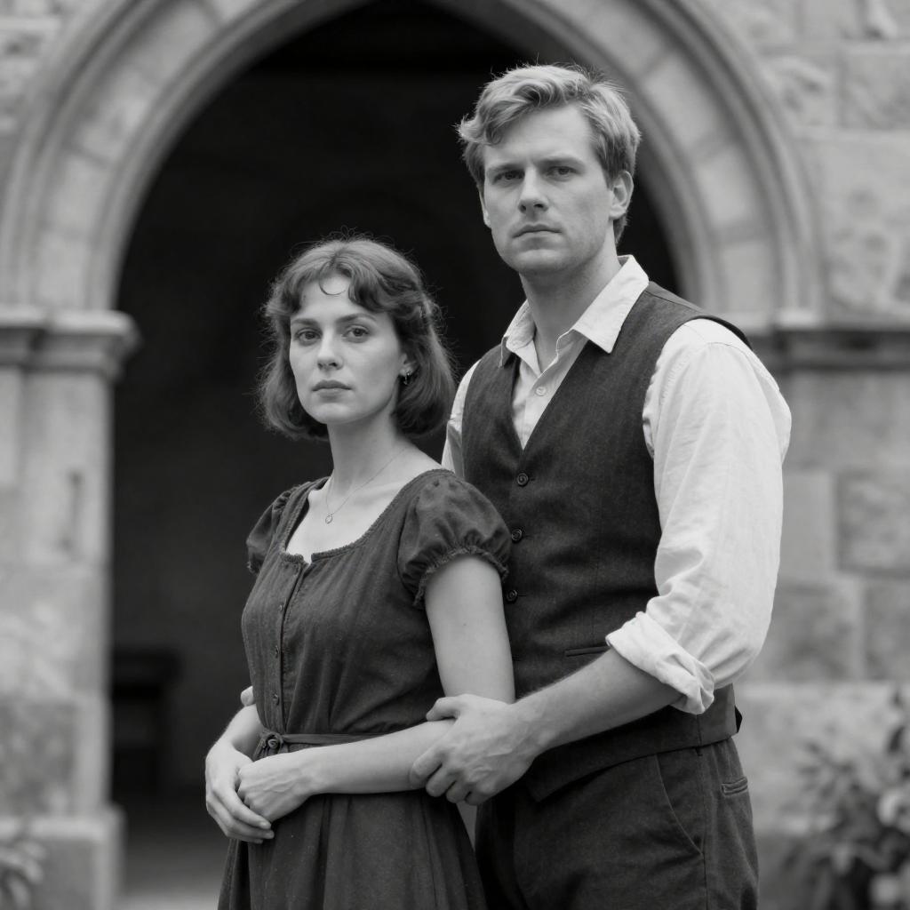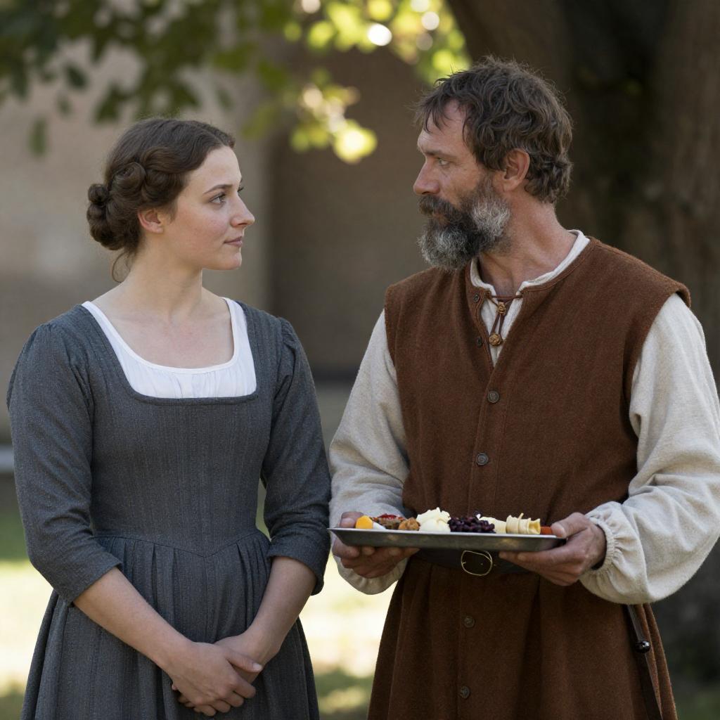 Photograph of a man and woman walking side by side in a sunlit, grassy garden. The woman has blonde hair, wears a white blouse, green bodice, and blue skirt, while the bearded man has a brown vest, white shirt, and brown pants. A stone wall and trees are in the background. A chicken is on the left.