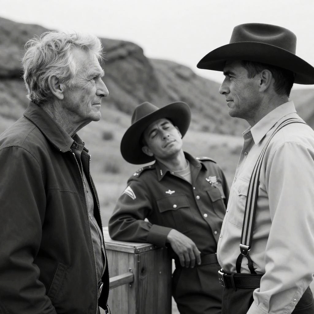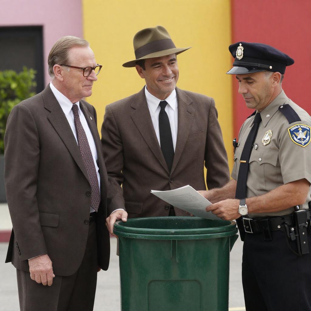 Photograph of three men outdoors. Tom Ewell in brown suit and glasses, Mickey Rooney in brown suit and fedora, and a police officer in uniform. Rooney holds a green trash can, officer hands him papers. Background includes a pink building and greenery. Ewell looks to the left, Rooney smiles, officer neutral. Bright yellow and red background.