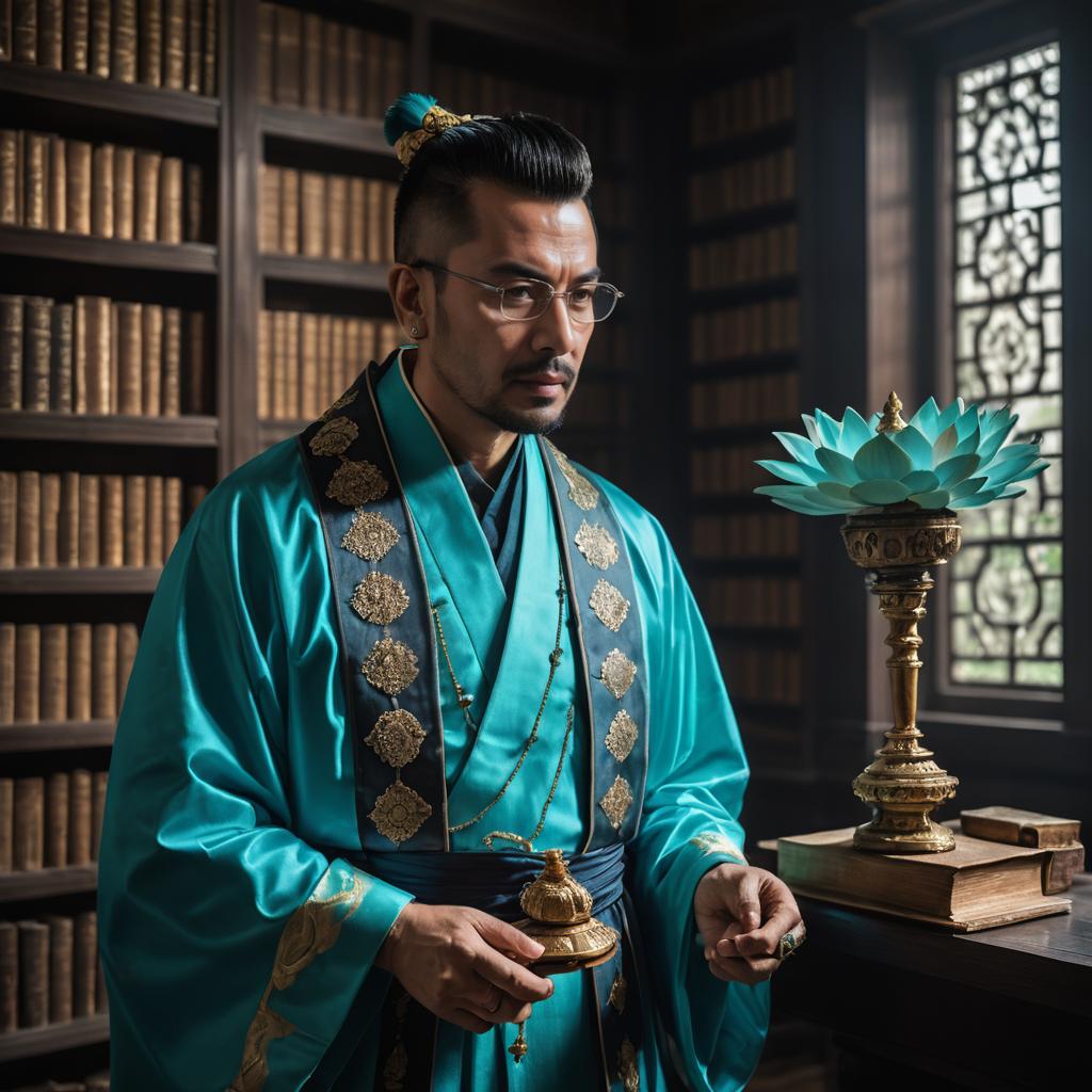 Photo of a Flat Stomach man, Faux Hawk, priest outfit, wearing a Cyan robe made of Lotus silk with a wooden accessory, ancient library, dramatic lighting