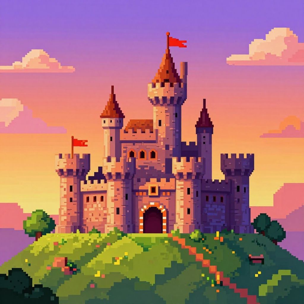 Pixel art castle perched on a hill at sunset, vibrant colors, medieval fantasy style, detailed turrets and flags fluttering, 16-bit video game aesthetic, pixelated clouds in the background