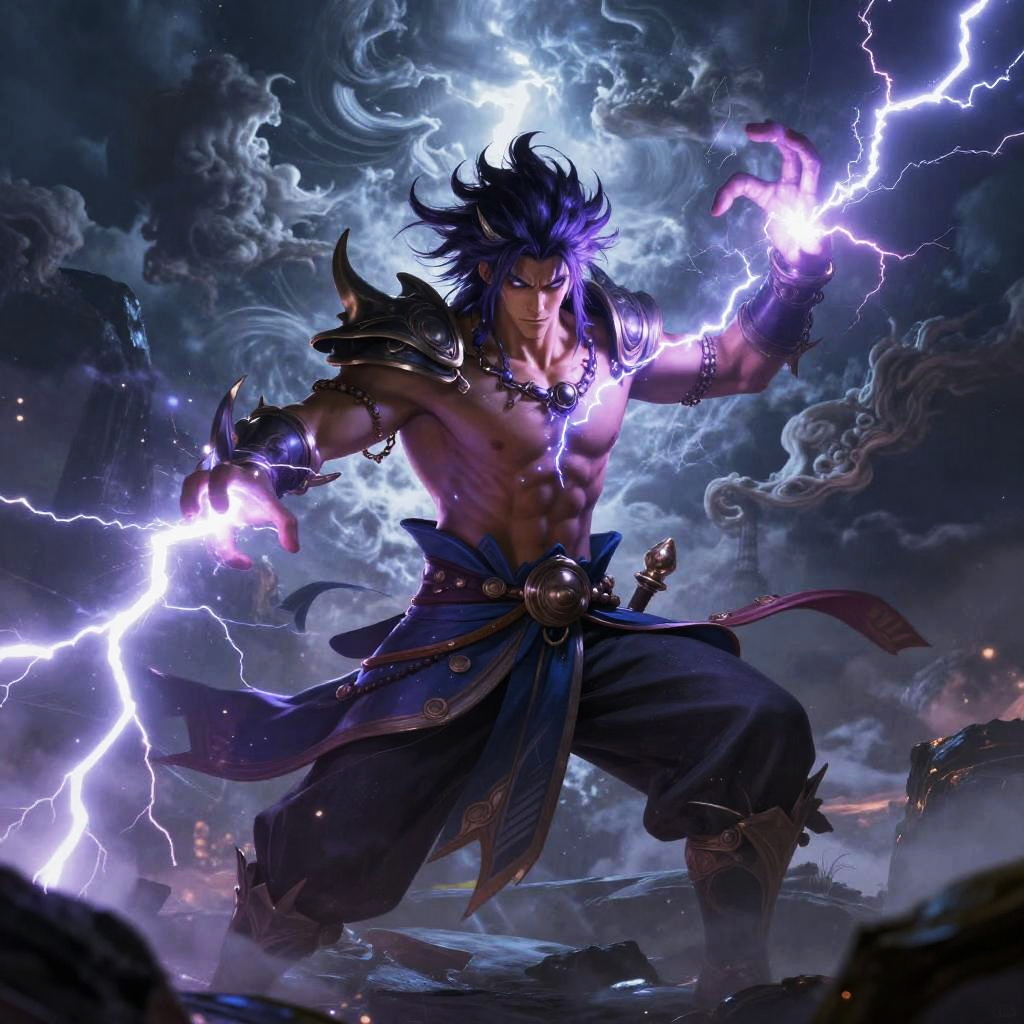 Zanba, powerful elemental mage summoning lightning from stormy skies, dramatic clouds swirling overhead, intense expression, vibrant energy effects, high resolution fantasy art.