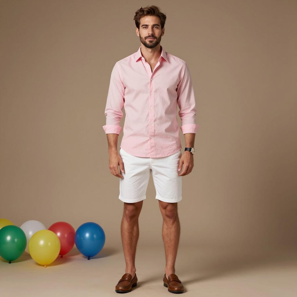 Outfit birthday man, photograph of a handsome man, standing, full body, looking at camera, medium shot, brown hair, short beard, pink button-up shirt, white shorts, brown loafers, colorful balloons on floor to left, neutral brown ured background, studio lighting, casual style, slightly relaxed posture