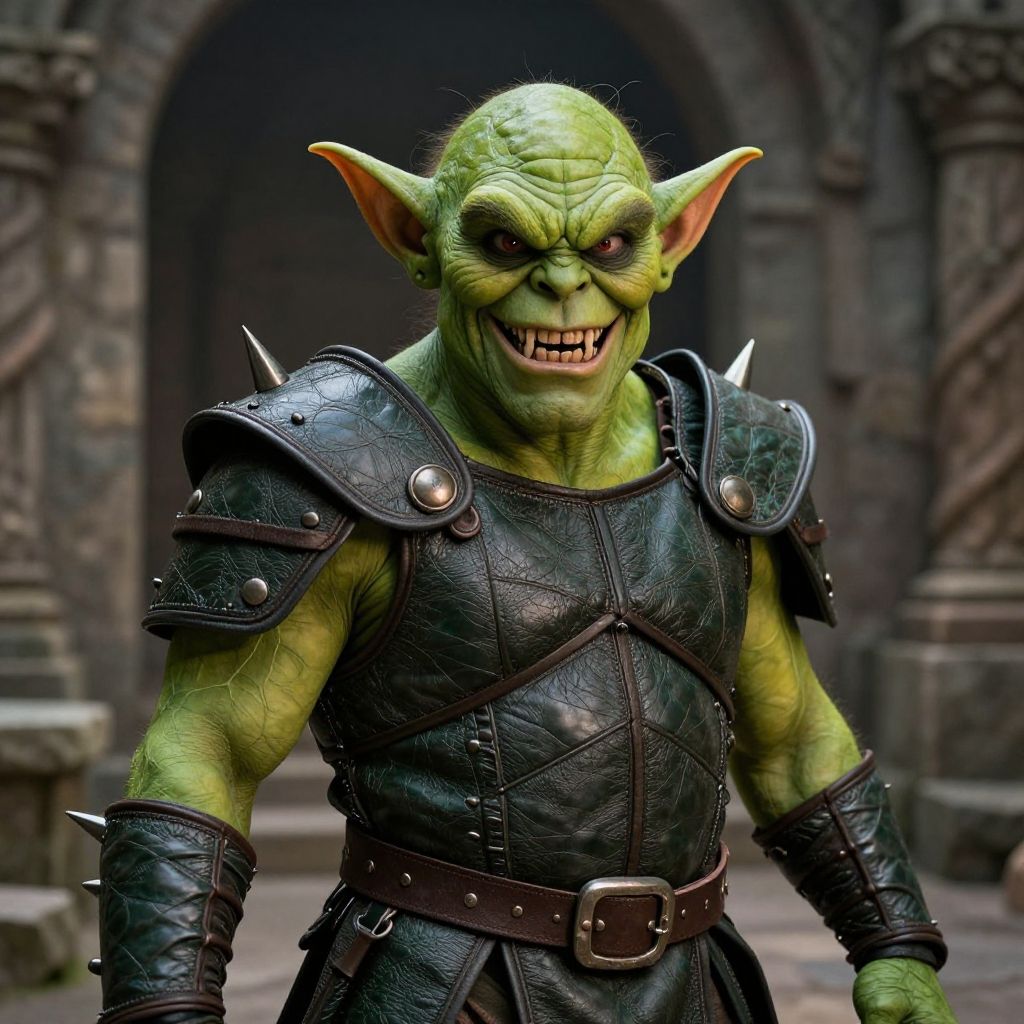 A fierce adult green goblin costume featuring textured leather armor, spiky shoulder pads, vivid green skin with painted veins, menacing grin with sharp teeth, set against an ancient stone ruin backdrop, atmospheric and cinematic.