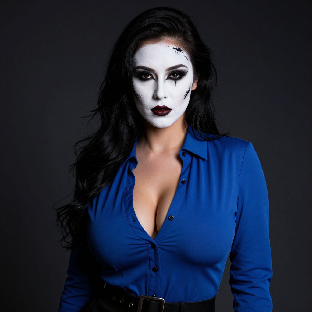 A sexy woman with long dark hair, big tits, and a stunning figure is wearing a blue shirt with a collar and buttons. She has a white face with bold black paint on it, giving her a dramatic and striking look. The scene is set in a dark, atmospheric studio with soft lighting, emphasizing her elegant and mysterious presence. She stands confidently, eyes locked forward, exuding allure and strength.