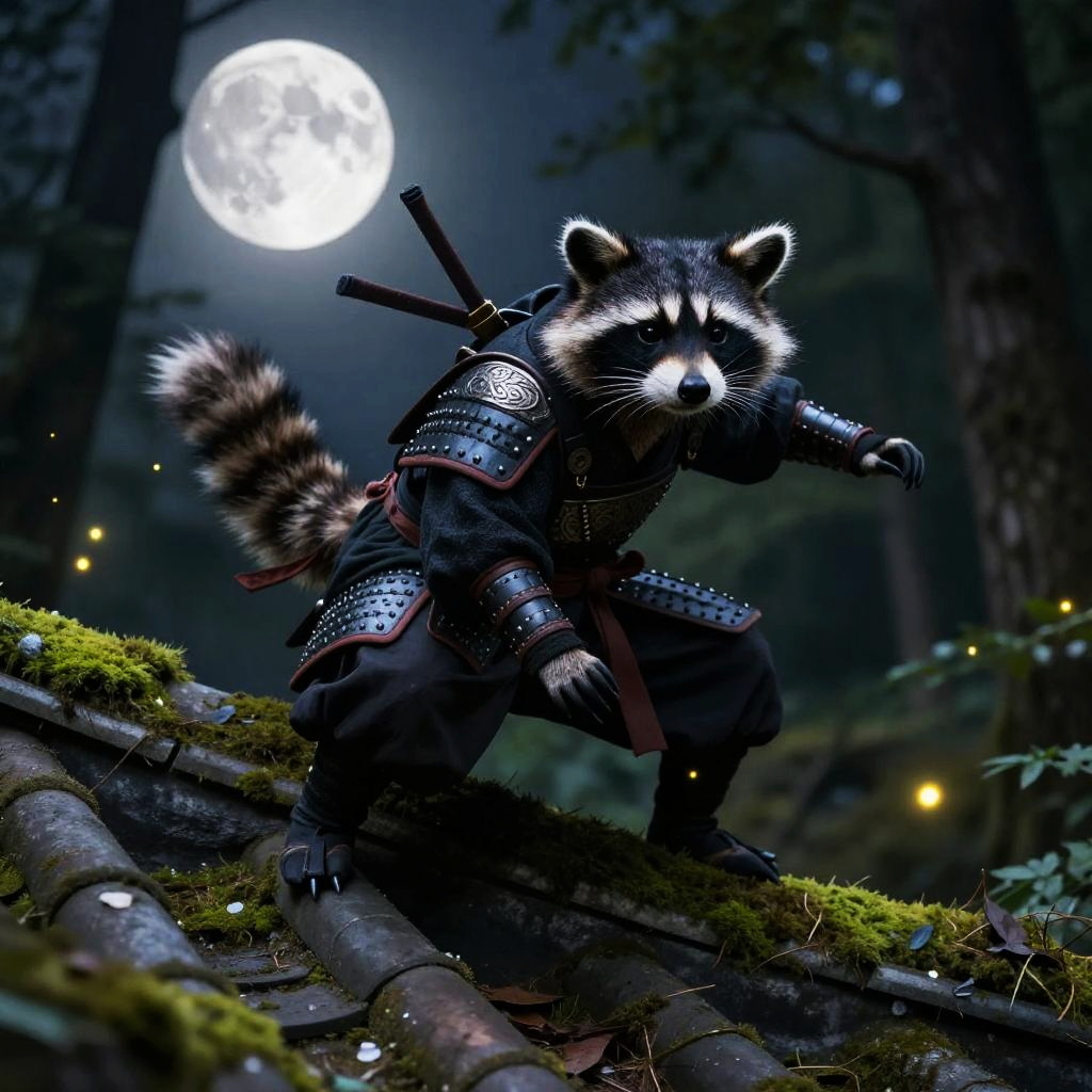 Raccoon ninja stealthily perched on a moss-covered rooftop under a full moon, traditional black ninja outfit with intricate armor details, forest background with glowing fireflies, dynamic pose ready to leap, cinematic lighting