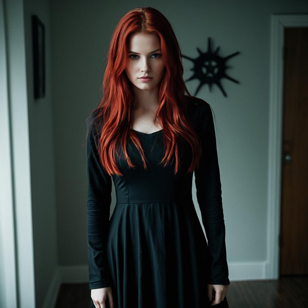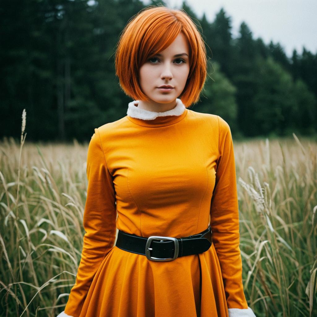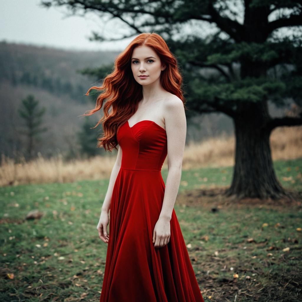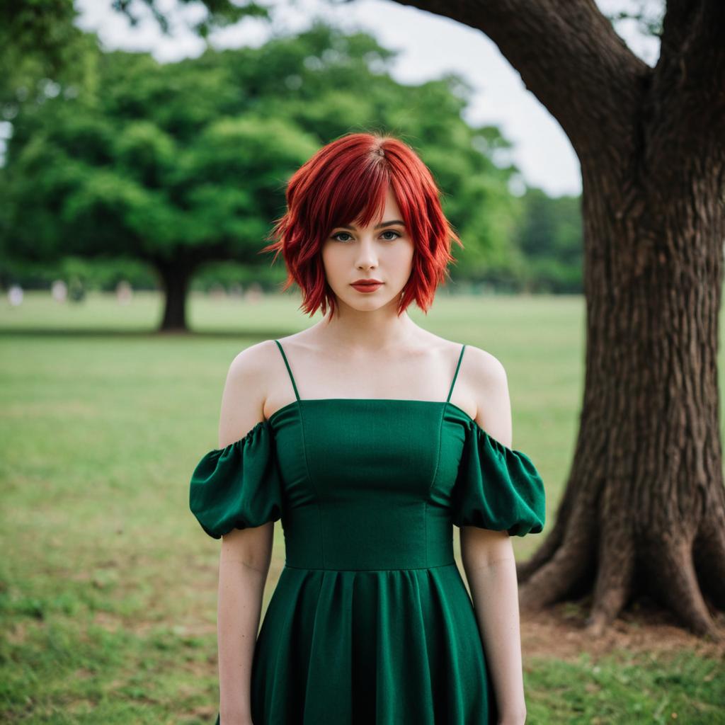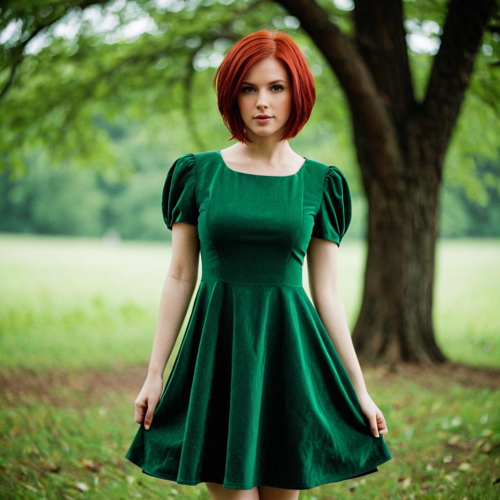 Portrait of a young adult woman with short red hair wearing a green dress with puff sleeves, standing outdoors in a natural environment with trees and soft-focus greenery in the background.