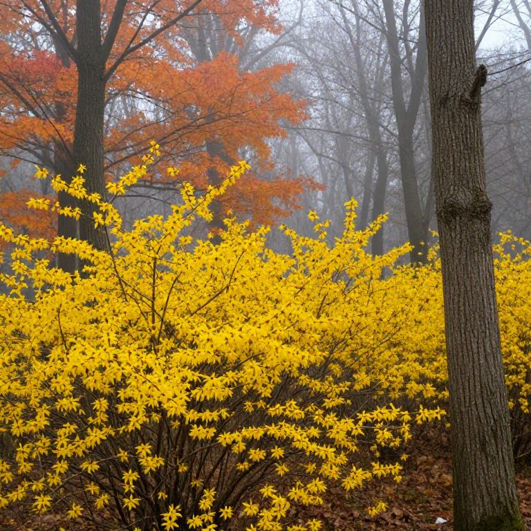 A scenic woodland landscape featuring hamamelis shrubs covered in bright yellow blossoms, autumnal hues in background with orange and red foliage, foggy atmosphere, magical realistic style, highlighting contrast between soft petals and rugged bark