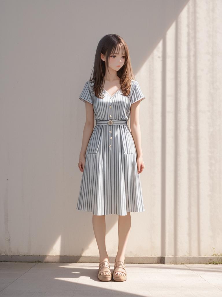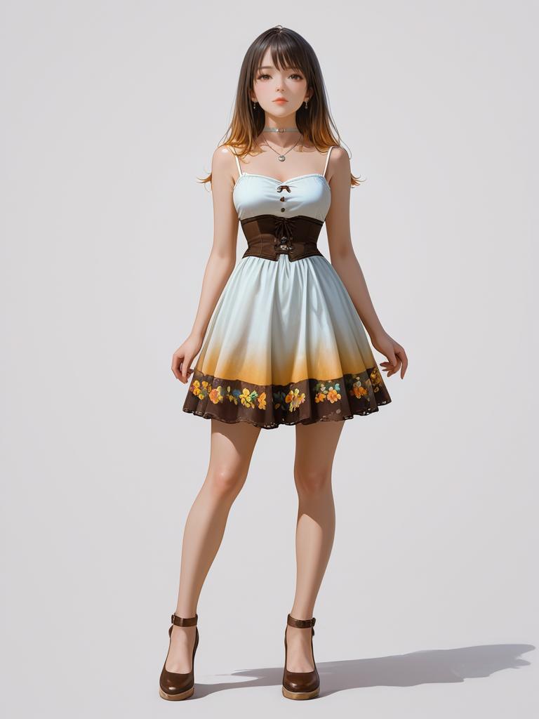 1girl, realistic face, full body shot, Woman, contemporary casual, sleeveless suede shift dress in earthy brown, V-neckline, two front pockets, belted waist with a tie-up feature, knee-length, lace tights with floral pattern, white background.