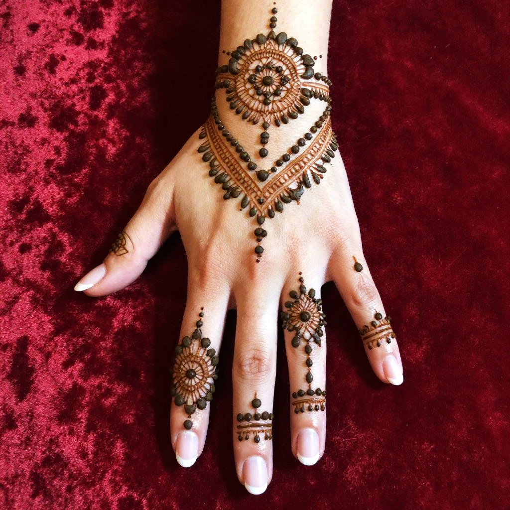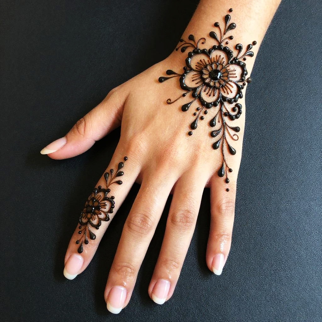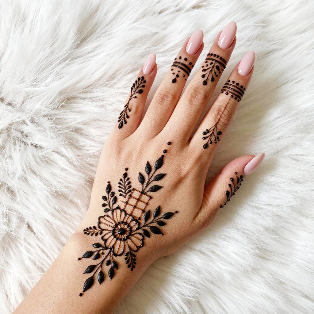 Photograph of a light-skinned hand with intricate black henna patterns covering the fingers and palm. The designs feature leaf and floral motifs with a grid pattern in the center. The nails are long and almond-shaped with a pale pink polish. The hand rests on a fluffy, white faux fur background, adding texture contrast. The image has a soft, natural light.