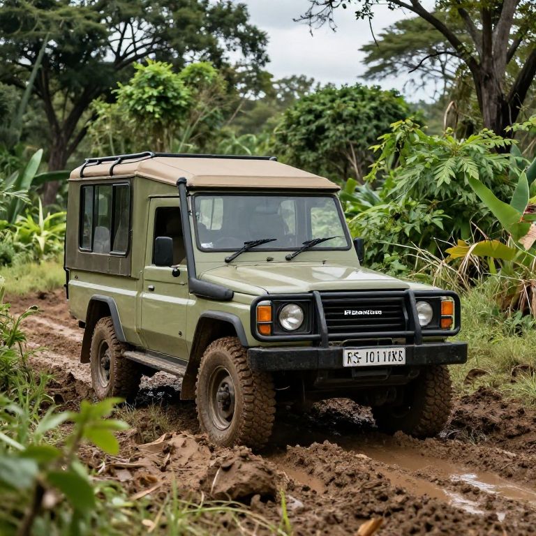 Custom Sticker green Land rover driving through foggy forest that is raining, mountains behind car, stylize 850,