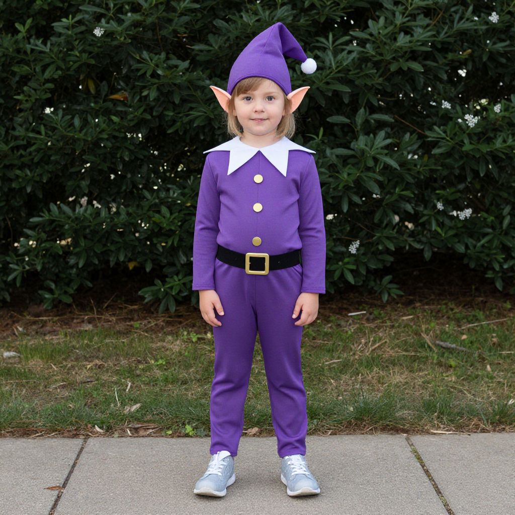 Photograph of a young child with pointed elf ears, wearing a purple elf costume with a white collar, black belt, and white shoes, standing on