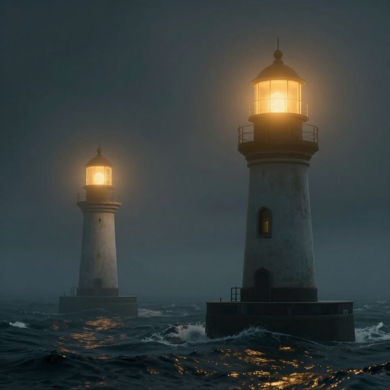 A moody, atmospheric 3D-rendered scene captures two lighthouses standing sentinel over a turbulent ocean, their warm, golden lights piercing through the misty gloom, evoking a sense of mystery and nostalgia as if they were crafted from trapped memories in this ethereal, cyberpunk-inspired seascape.