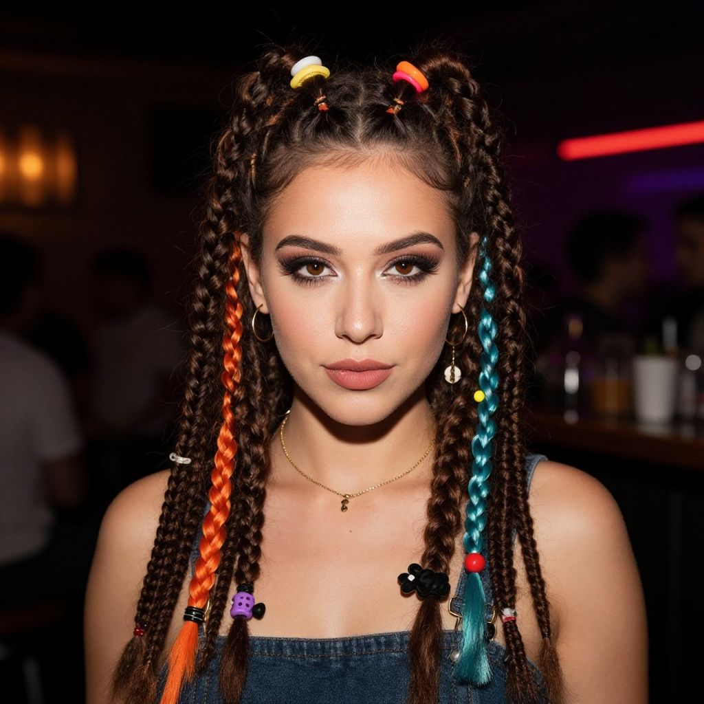Photograph of a young woman with light brown skin and dark brown eyes, standing in a dimly lit bar. She has long, dark brown braids adorned with colorful beads and small bows. Her eyebrows are thick and dark, and she wears dramatic, winged black eyeliner with dark mascara. She has full, dark pink lips and wears a simple gold necklace. Her top is dark blue and sleeveless. The background is blurred, with dark tones and a hint of a red light, creating a nightclub atmosphere. The image has a high contrast and vibrant colors, highlighting her braids and makeup.