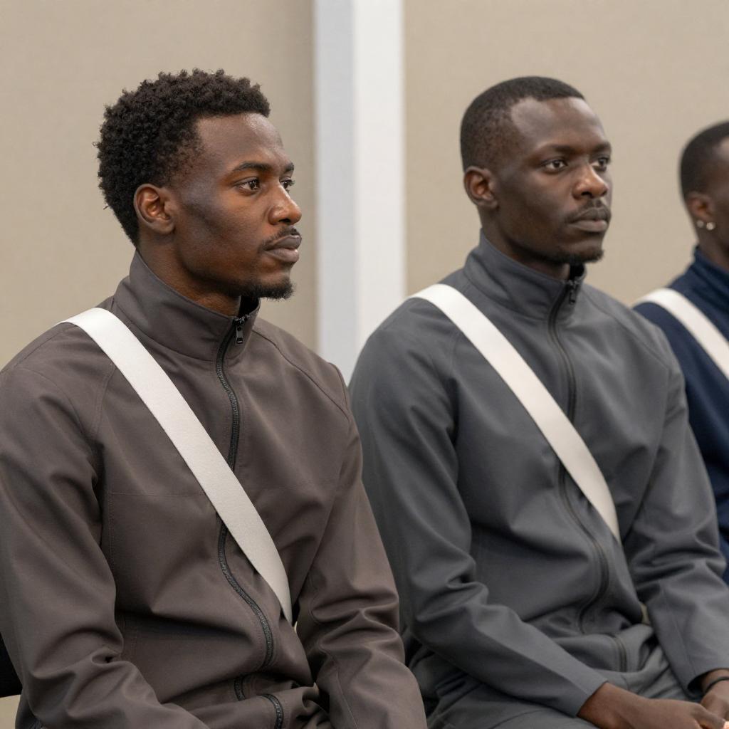 Photograph of two African-American men sitting side by side. Both wear futuristic, gray, high-necked jackets with white straps. The man on the left has short curly hair, brown jacket, and looks at the other man. The man on the right has short buzz cut, gray jacket, and looks slightly to the side. Background includes beige walls and white vertical beams. A third person is partially visible on the right. Intense expressions.