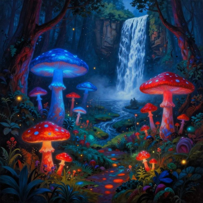 Vibrant stained glass window depicting a mystical forest with large red-and-white-spotted mushrooms, ferns, and trees, surrounded by intricate blue and