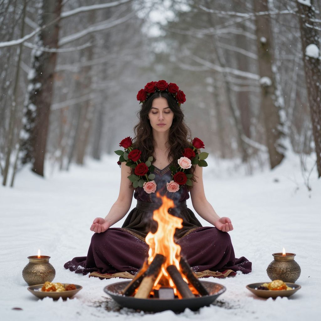 A woman in a snowy forest, adorned with roses, meditates under a ceremonial fire, embodying spiritual practices such as kundalini awakening and chakra alignment.
