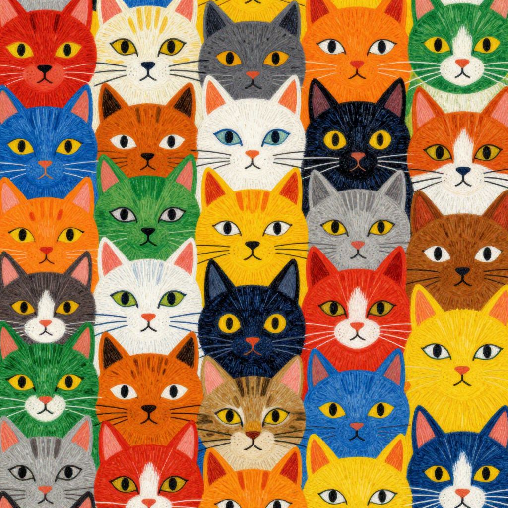 The image presents a highly detailed, seamless pattern featuring a multitude of cat faces, each uniquely colored and stylized. The cats are drawn in a whimsical, cartoonish manner, reminiscent of the Art Mix by Loony Tunes, Ralph Steadman, and Ronald Searle styles. The color palette is vibrant, with a variety of hues including red, orange, yellow, green, blue, and white, creating a lively and engaging visual experience. The cats are arranged in a seemingly random yet harmonious manner, filling the entire frame of the image. Each cat face is distinct, with varying expressions and features, such as different eye shapes, nose sizes, and whisker patterns. The overall composition is dynamic, with the cats appearing to interact with each other through their overlapping and intermingling forms. The texture of the drawing is rough and textured, adding a tactile quality to the image. The spatial relationships between the cats are varied, with some appearing closer to the viewer and others further away, creating a sense of depth and dimension. The image is a celebration of the cat, showcasing its diverse and playful nature through a multitude of artistic interpretations.