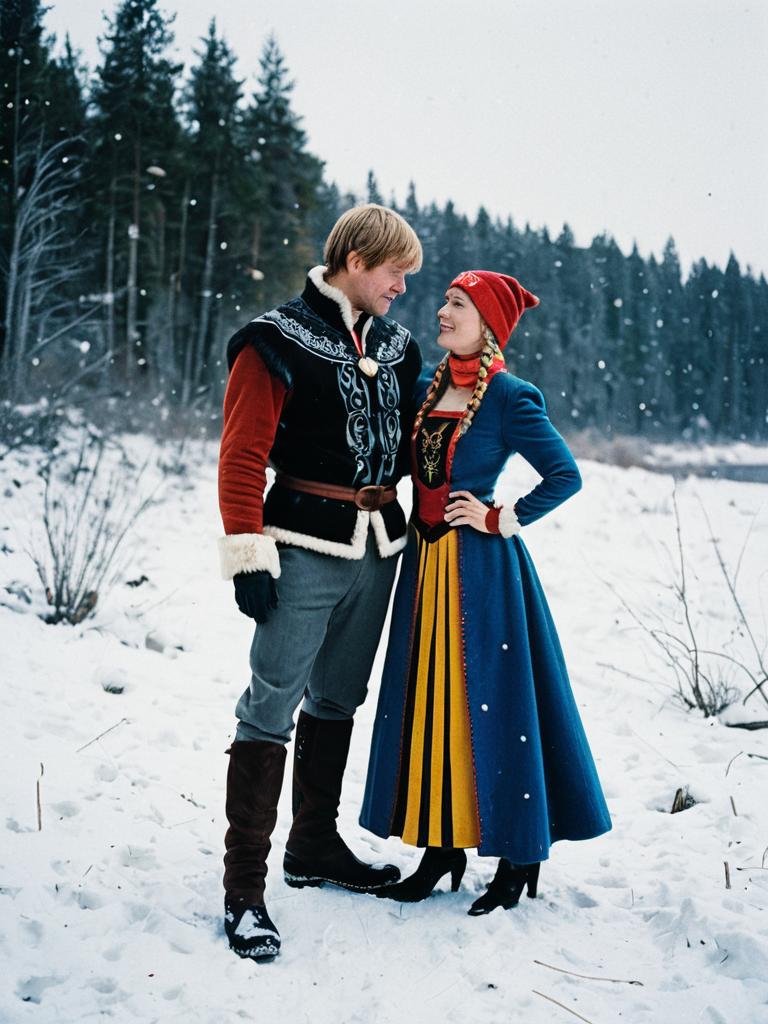 Couple in Anna and Kristoff Costume, photorealistic outdoor portrait in snowy landscape