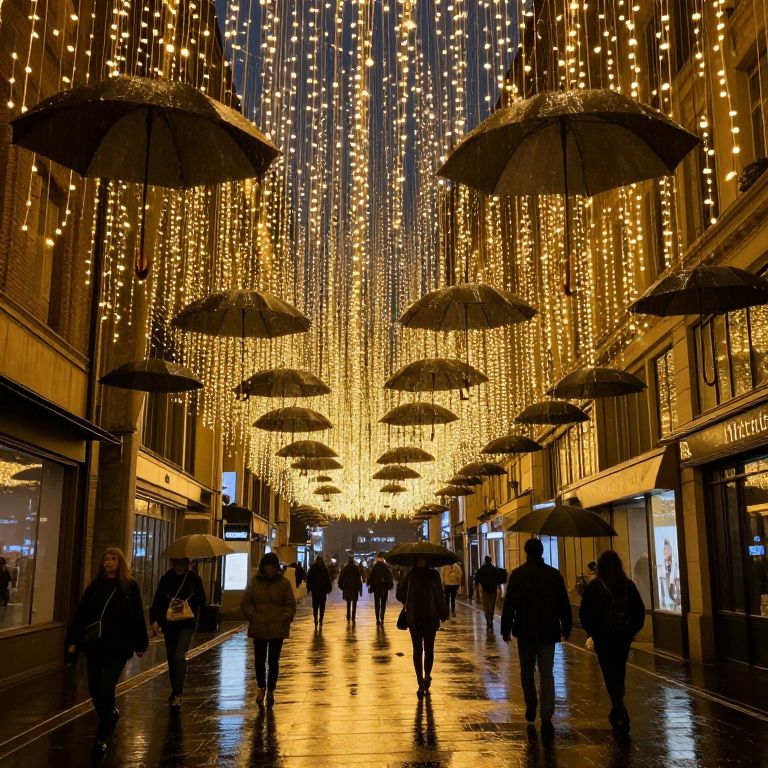 Photograph of a nighttime city street adorned with an enchanting light display. Rows of golden fairy lights hang vertically from the buildings, creating a warm, glowing canopy. Large black umbrellas are suspended overhead, contrasting with the lights. The wet, reflective pavement gleams under the illumination. People of various ages, dressed in dark winter clothing, walk along the street, some holding umbrellas. Storefronts with illuminated signs line both sides of the street. The overall ambiance is magical and festive, with the lights and reflections adding a sense of wonder to the urban setting.