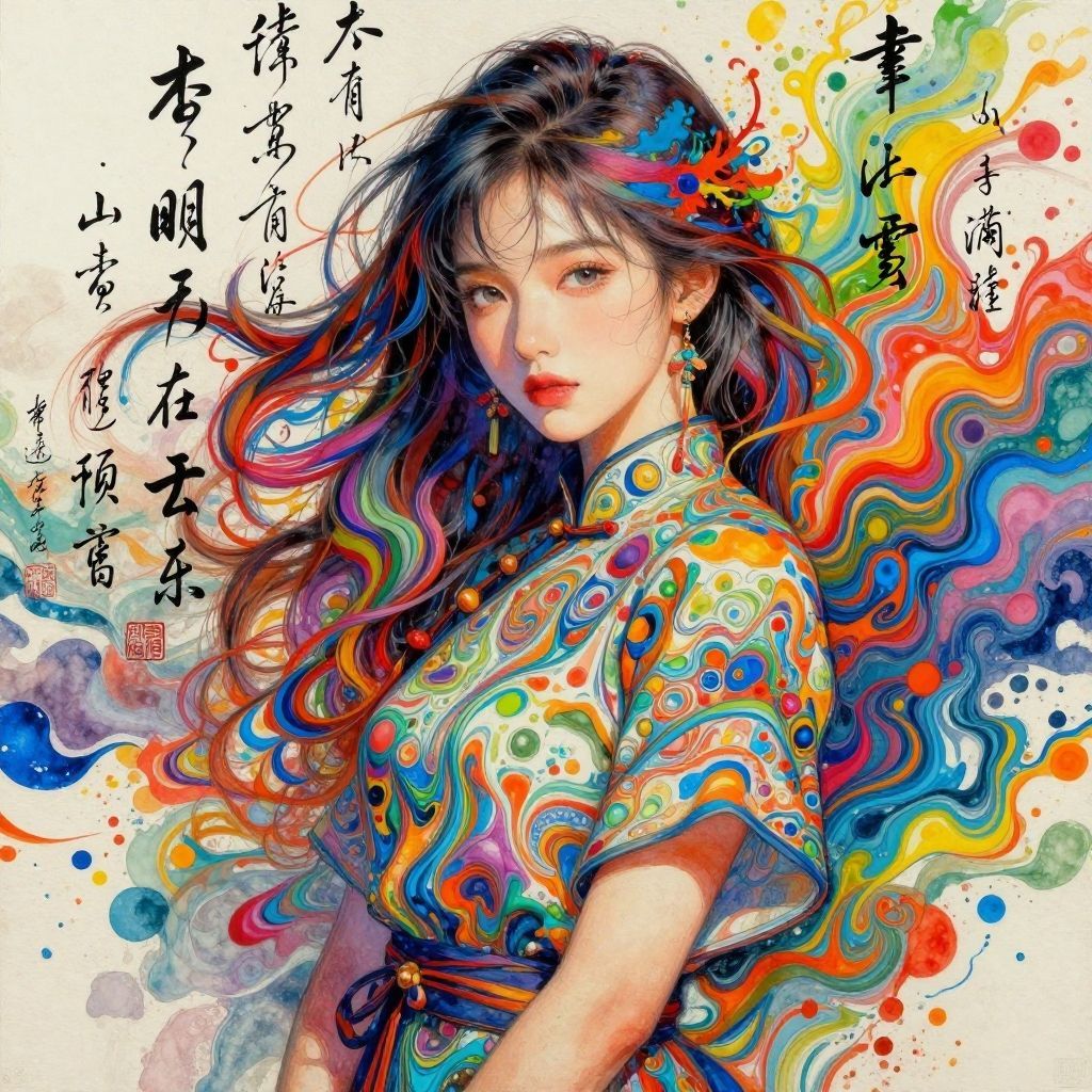 This vibrant digital illustration features a young East Asian woman with long, flowing black hair that transitions into a colorful, wavy pattern of blues, reds, yellows, and greens. She wears a short-sleeved, traditional Chinese-style blouse adorned with a swirl of colorful patterns matching her hair. Her expression is serene yet slightly melancholic, with soft, pink lips and delicate features. Japanese characters are written in black ink around her, adding an artistic and cultural touch. The background is a white canvas splattered with colorful paint, enhancing the image's dynamic and lively feel. The overall style is a fusion of traditional and modern, with a focus on vivid colors and fluid lines.