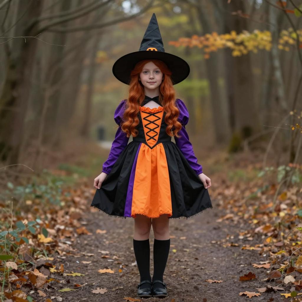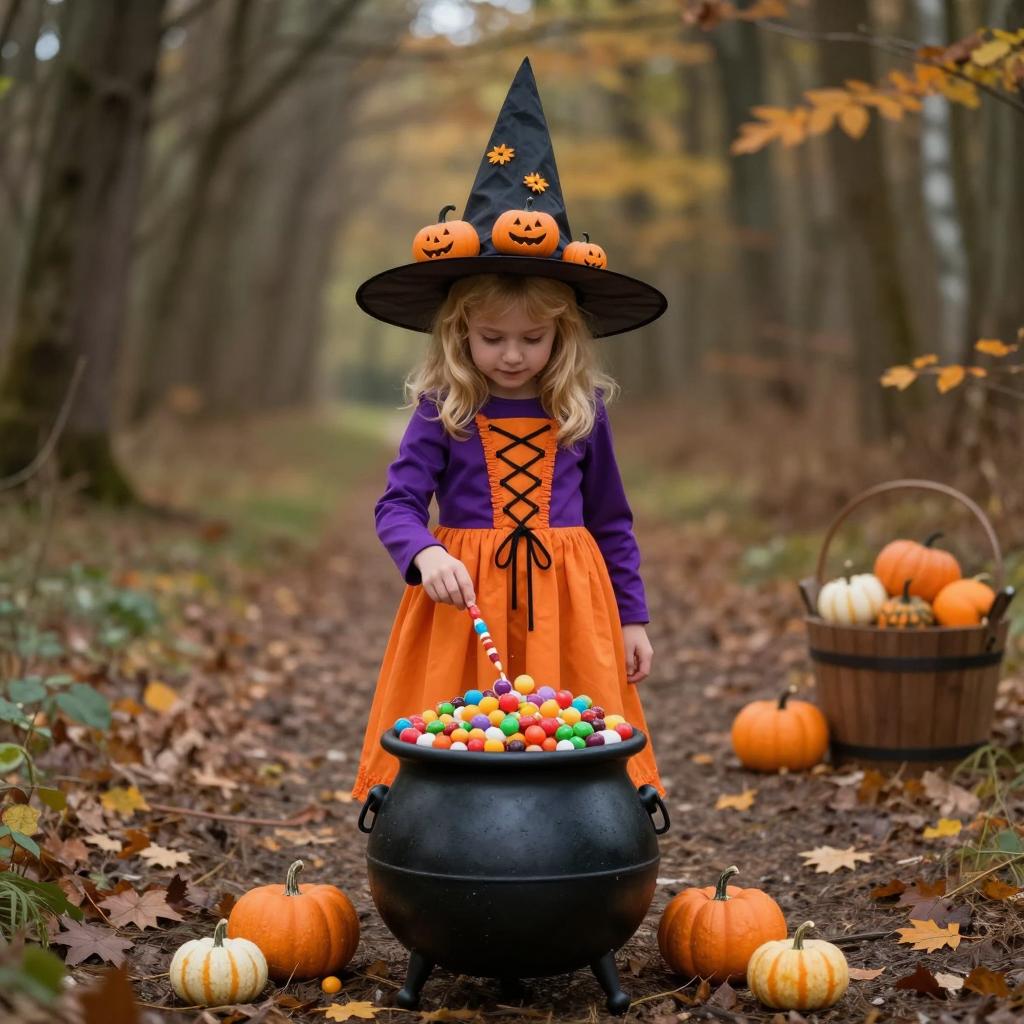 Candy catcher cauldron witch, photograph of a young blonde girl wearing a witch hat with pumpkins, purple long-sleeve top, orange dress with lace-up front, standing in a forest path, black cauldron filled with colorful candy, small pumpkins scattered on ground, wooden bucket with pumpkins in background, autumn setting, soft natural light, dreamy and whimsical style