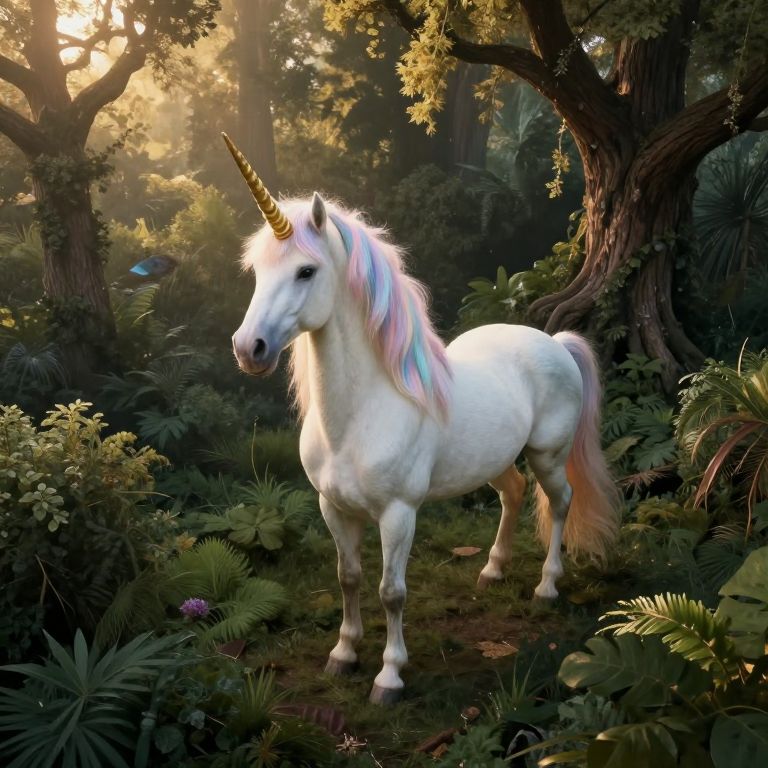 Photorealistic CGI of a white unicorn with a multicolored mane standing in a lush, sunlit forest, surrounded by dense greenery and tall