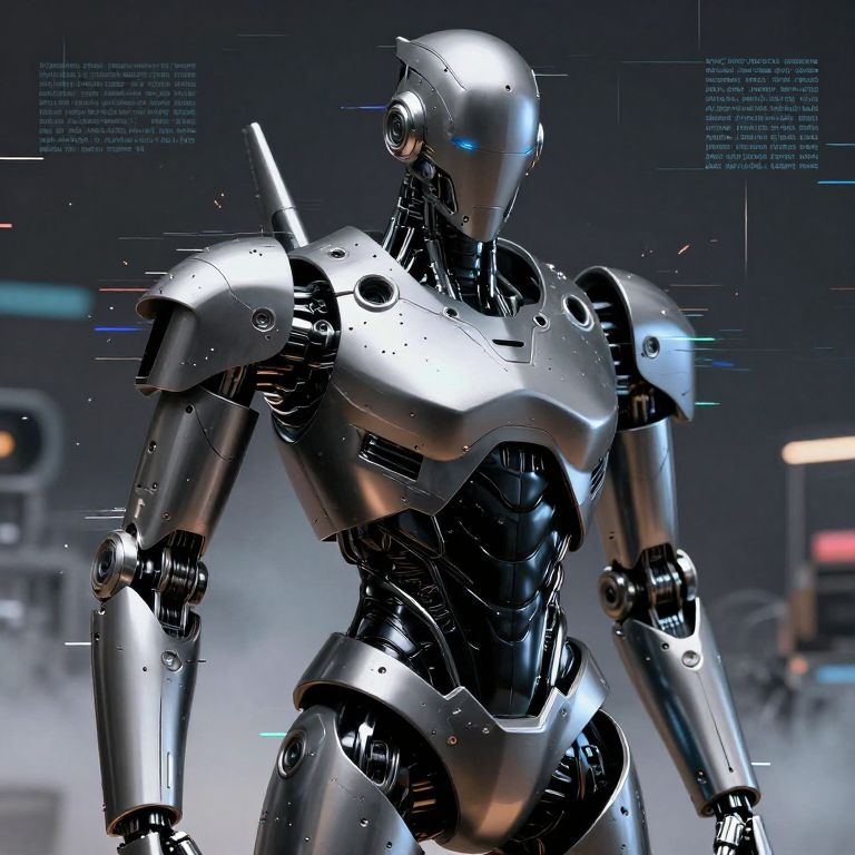 Digital CGI image of a futuristic, silver and black humanoid robot with glowing blue eyes, standing in a dimly lit, high-tech lab.