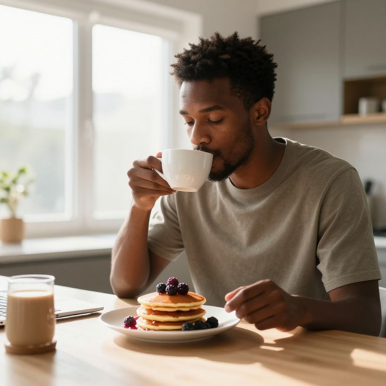 Black guy eating breakfast in a modern kitchen, sipping coffee while enjoying pancakes topped with fresh berries, morning sunlight streaming through large windows, warm and inviting ambiance, detailed textures on food and kitchenware