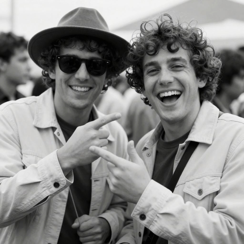 Three men lying on a bowling lane, laughing, surrounded by scattered bowling pins. The man on the right has curly brown hair, wears a denim jacket, and holds a green object. The man in the middle has dark hair, a plaid shirt, and smiles. The man on the left wears a white cap and red shirt, with a surprised expression. Background includes a patterned wall.