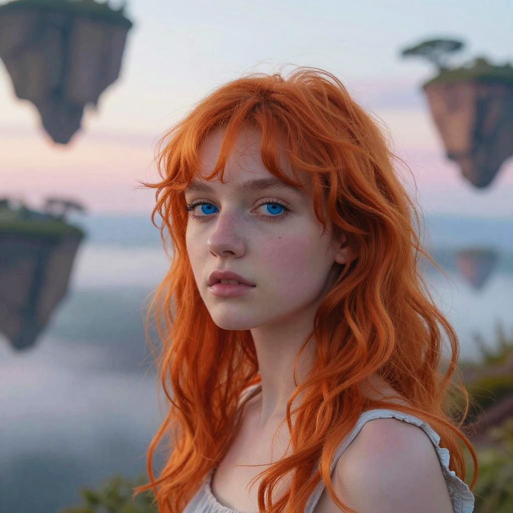 Orange hair and blue eyes model in a surreal dreamscape, floating islands, pastel sky, ethereal atmosphere, soft focus, vibrant hues, detailed facial expression