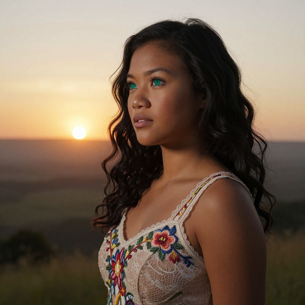 A portrait photograph showcases a young Polynesian woman with porcelain skin and captivating emerald eyes. Her raven hair falls in loose waves around her shoulders, framing her delicate features. Adorned in a lace bodice intricately embroidered with floral patterns, the soft fabric accentuates her slender figure. In this moment of contemplative introspection, she gazes out at a vast landscape bathed in golden twilight as the sun sets beyond the horizon. The unusual angle, slightly above and behind her right shoulder, frames her beautifully, highlighting the dramatic play of light across her face while hinting at the expansive beauty that lies within her gaze.