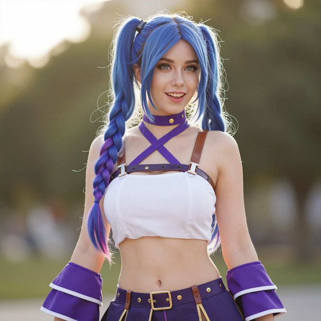 Sexy cosplay woman character wearing Mylene Flare Jenius costume. Realistic photo. Jane Doe dressed as Mylene Flare Jenius. Realistic photo, caucasian woman, pretty cute face, very big breasts, outdoors, cheerful lifestyle vibe, golden hour
