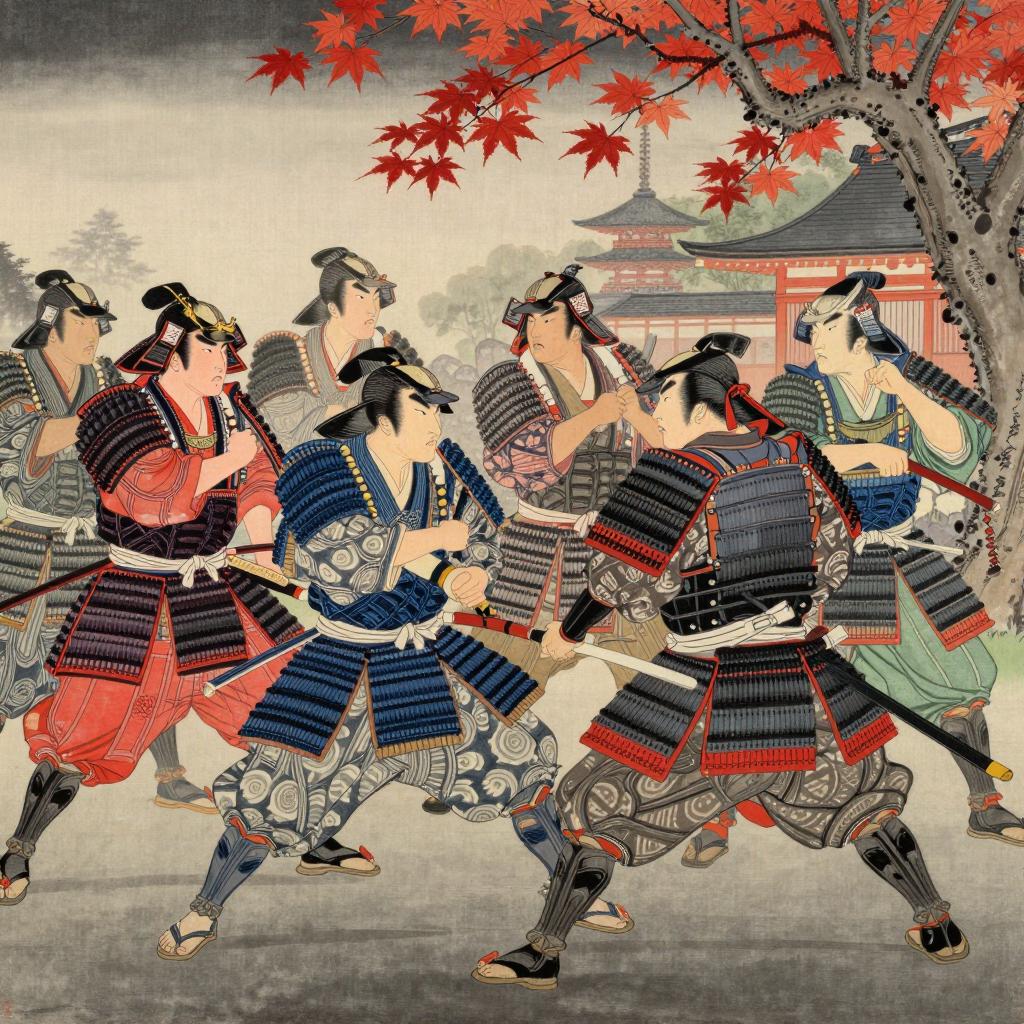 An oil painting depicting a group of samurai warriors engaged in battle, styled in traditional ukiyo-e art. The scene is vibrant and energetic, with expressive brushstrokes and vivid colors highlighting the warriors' traditional armor and kimonos. The background features mist and red maple trees, evoking a historic Japanese setting with pagoda roofs visible in the distance.
