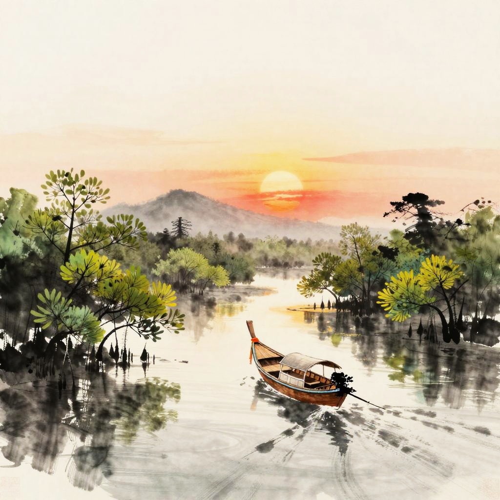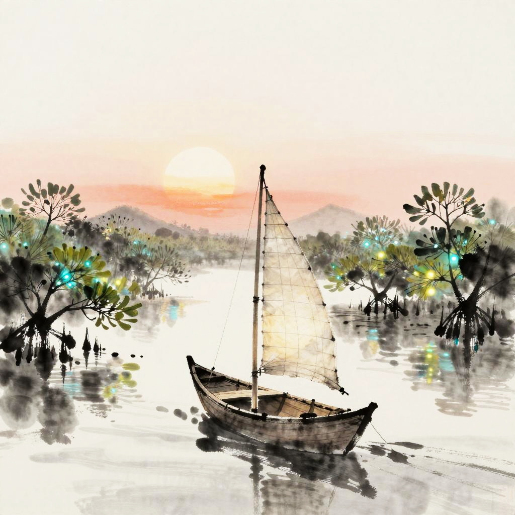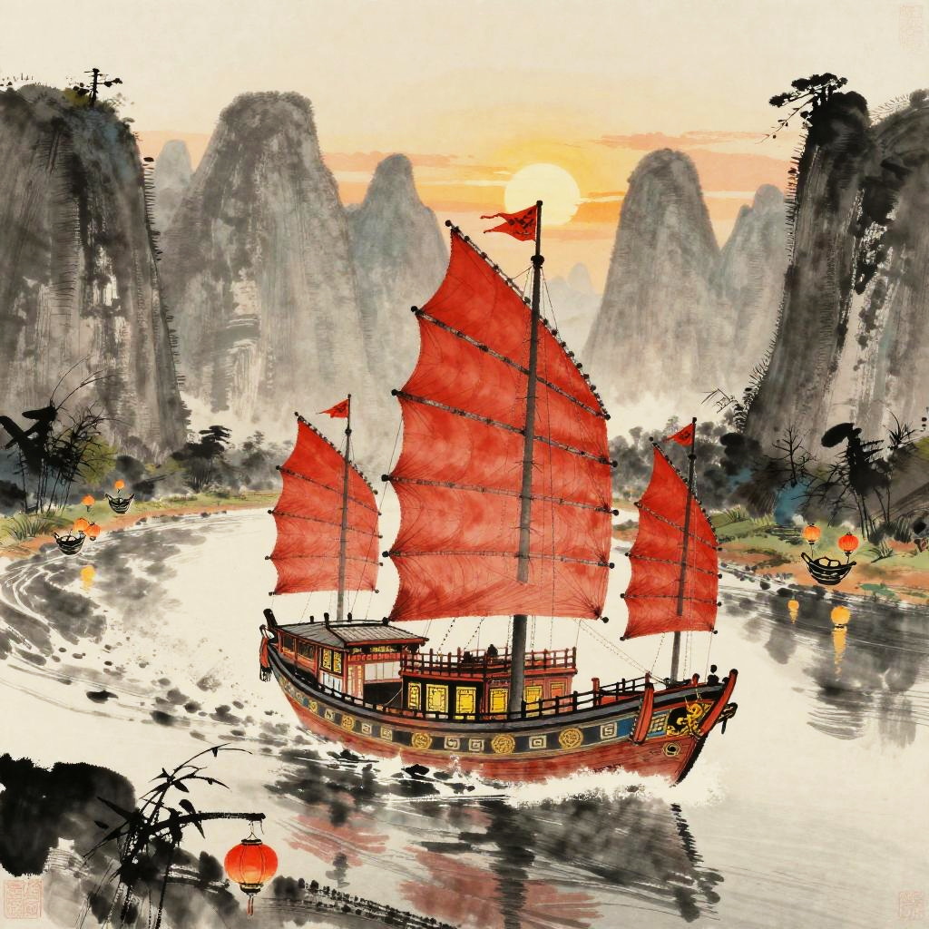 A Shanshui style ink wash painting, illustrating a ornate Chinese junk with red sails sailing into a karst river gorge dotted with fishermen's lanterns at sunset.