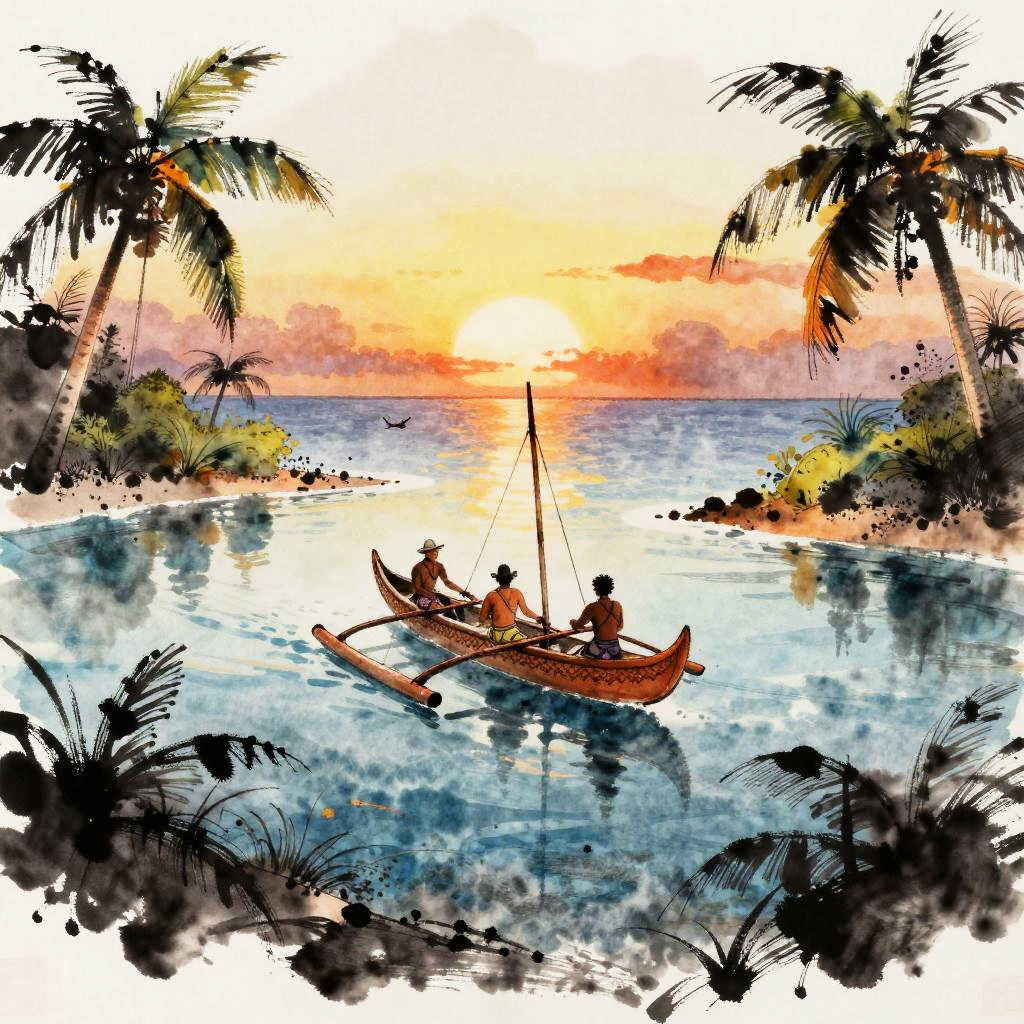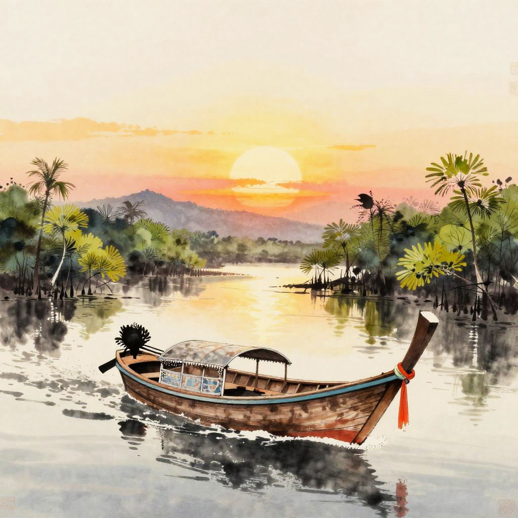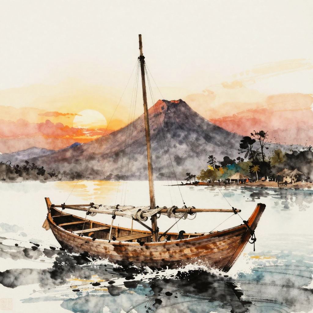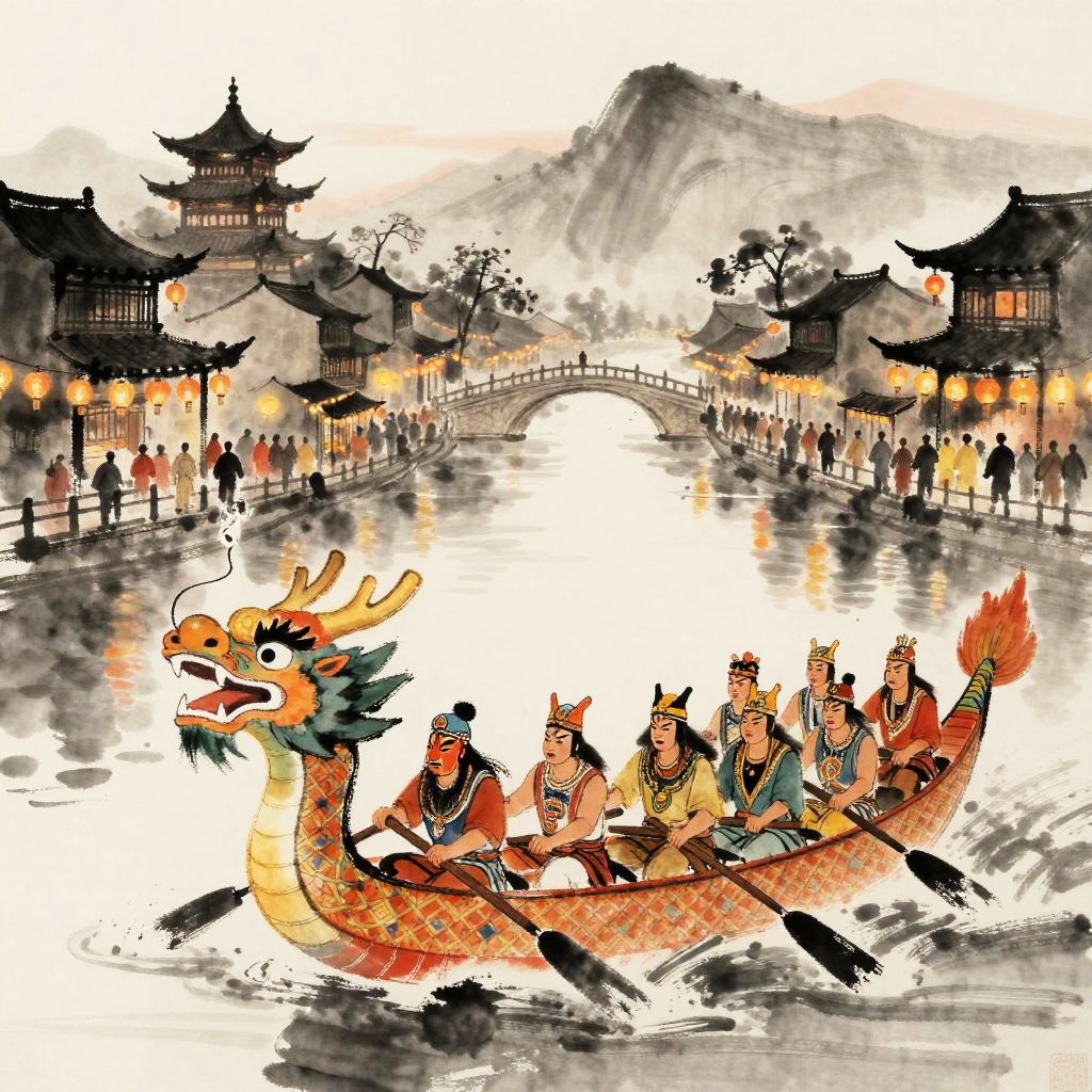 A Shanshui style ink wash painting, illustrating a ornate Chinese junk with red sails sailing into a karst river gorge dotted with fishermen's lanterns at sunset.